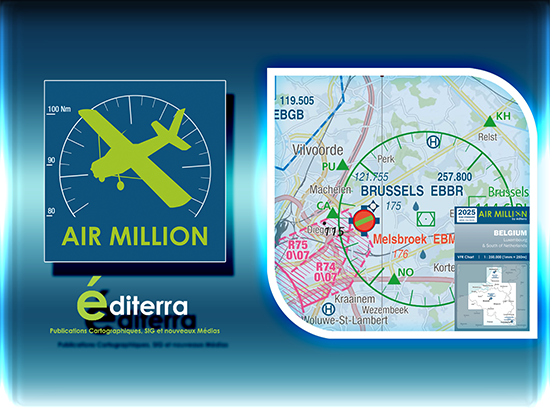 The Air Million maps, published by the French company Editerra, features VFR aeronautical charts designed for general aviation pilots. Clear, comprehensive, and updated annually, they provide optimal readability of airspace, restricted areas, aerodromes, and navigation aids.